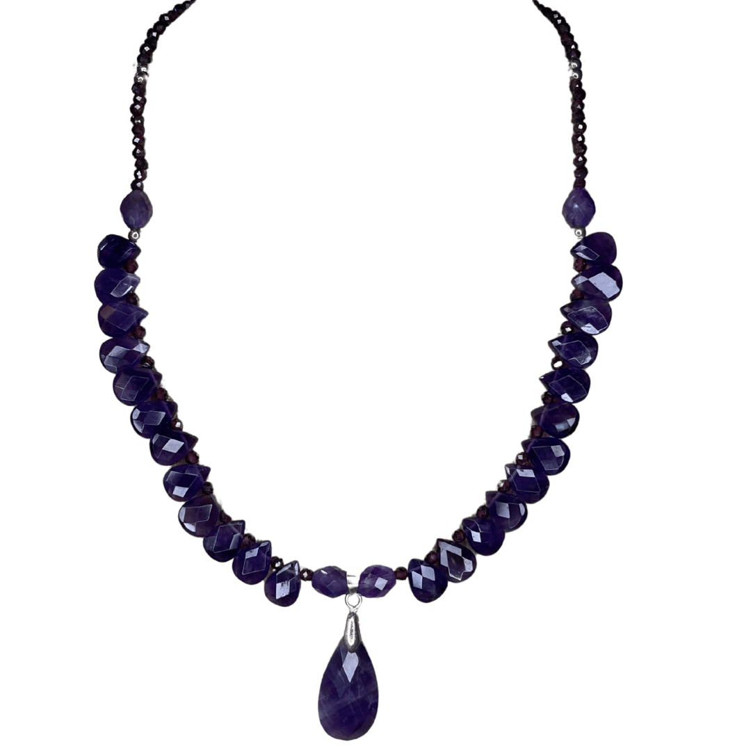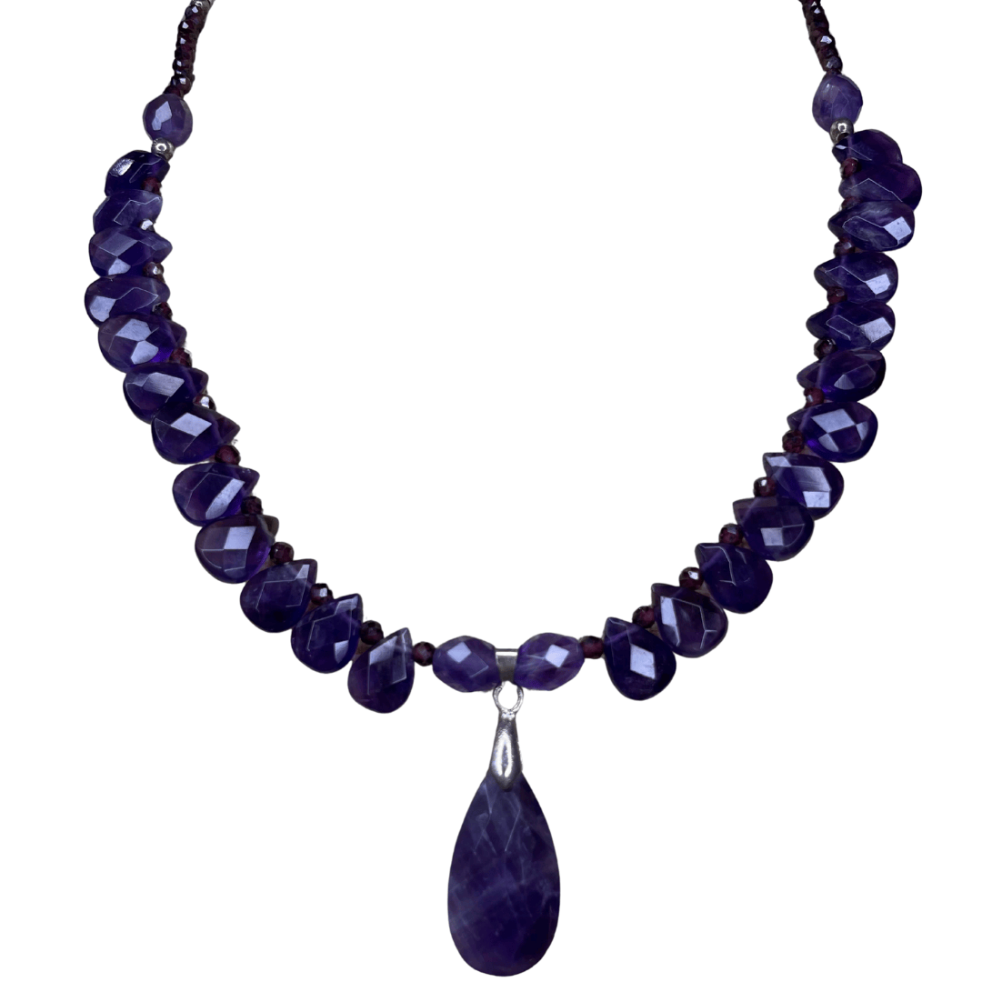 El Collar Handmade drop of amatista es una pieza artesanal que destaca por la intensidad y elegancia de sus tonos morados. Elaborado a mano con piedras de amatista naturales, su diseño se realza con un delicado colgante central que aporta equilibrio y protagonismo a la composición.