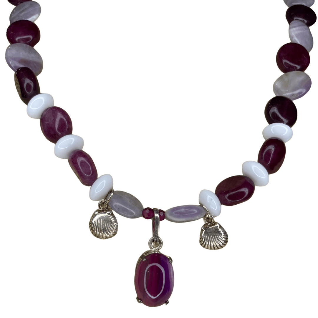 El Collar Handmade purple shell es una pieza artesanal inspirada en la profundidad del mar y la armonía de sus colores. Su diseño combina piedras naturales en tonos morados, lilas y blancos, cuidadosamente ensambladas a mano, junto a detalles marinos de plata que evocan conchas y elementos costeros.